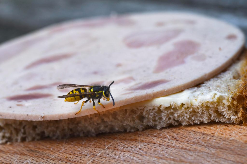 Almost in unison the wasps reached the other side of the sandwich and were attracted to a sliver of turkey hanging beyond the cut of the sandwich. They took some swift bites of the turkey and flew off.